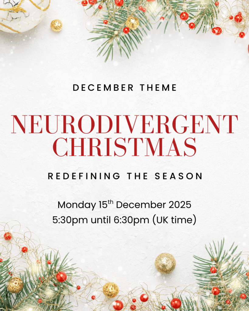 What: We’ll be discussing how to navigate the Christmas period (whether you celebrate or not) with neurodivergent needs in mind, exploring ways to let go of overwhelming seasonal expectations while creating celebrations that genuinely work for us, from managing sensory overload to setting boundaries around social demands.
